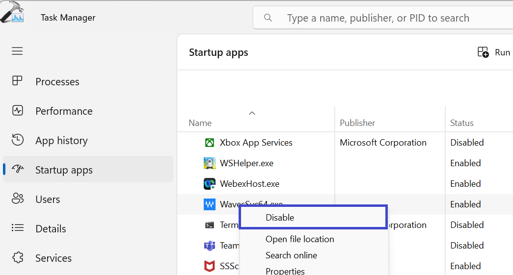 4. Απενεργοποιήστε όλα τα στοιχεία ένα προς ένα. Για να το απενεργοποιήσετε, κάντε δεξί κλικ σε αυτό και, στη συνέχεια, επιλέξτε το "Καθιστώ ανίκανο"Επιλογή.