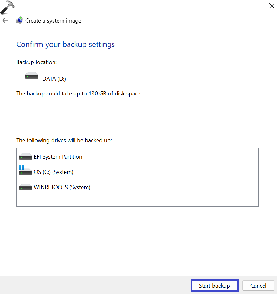 5. Κάντε κλικ στο "Ξεκινήστε το αντίγραφο ασφαλείας"Για να ξεκινήσετε τη διαδικασία δημιουργίας αντιγράφων ασφαλείας και τα Windows θα δημιουργήσουν μια πλήρη εικόνα συστήματος με βάση τις επιλογές σας.