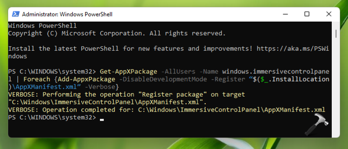 Get-AppXPackage -AllUsers -Name windows.immersivecontrolpanel | Foreach {Add-AppxPackage -DisableDevelopmentMode -Register "$($_.InstallLocation)AppXManifest.xml" -Verbose}