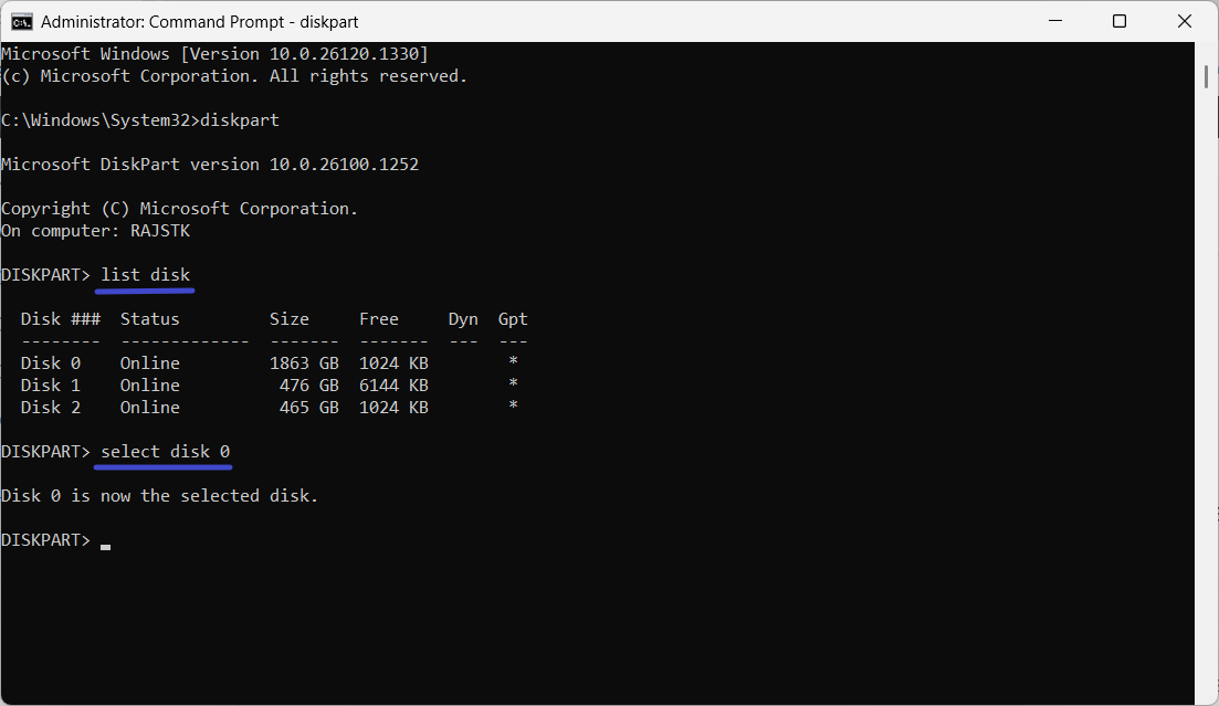 #Στη στήλη GPT υπάρχει δίσκος GPT. Εάν δεν υπάρχει αστερίσκος, είναι ένας δίσκος MBR.4. Στη συνέχεια, εκτελέστε το "Επιλέξτε δίσκο #"εντολή για να επιλέξετε την κύρια μονάδα σας. Φροντίστε να αντικαταστήσετε