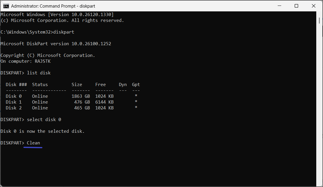 Γκαζάρι"Εντολή για τη διαγραφή όλων των διαμερισμάτων.6. Στη συνέχεια, χρησιμοποιήστε το "Μετατροπή GPT "ή "Μετατροπή MBR "εντολή ανάλογα με το διαμέρισμά σας. Εάν το τρέχον διαμέρισμά σας είναιMbr, μετατρέψτε το σε