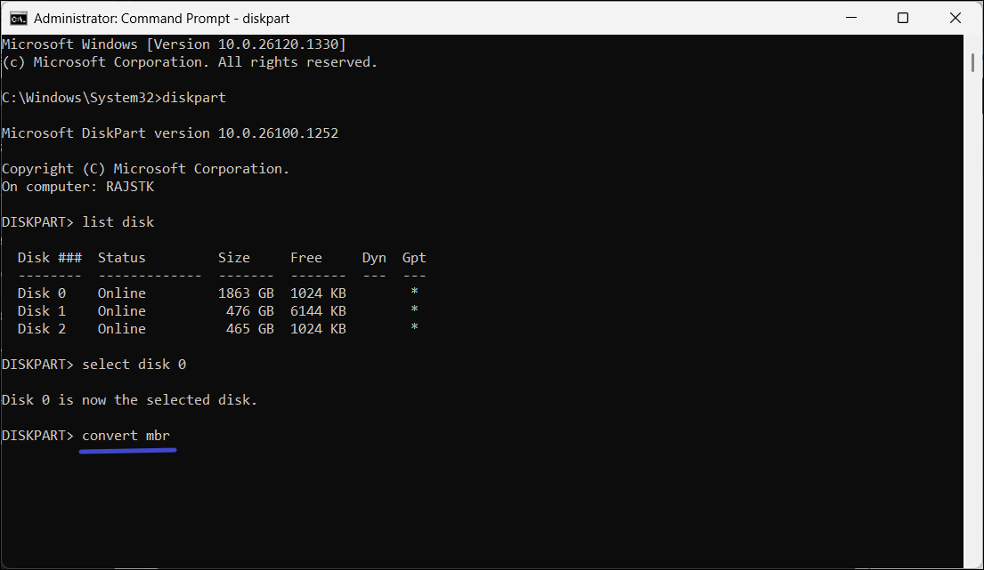 7. Μετά τον έλεγχο συμβατότητας, εκτελέστε αυτήν την εντολή για να μετατρέψετε το δίσκο: