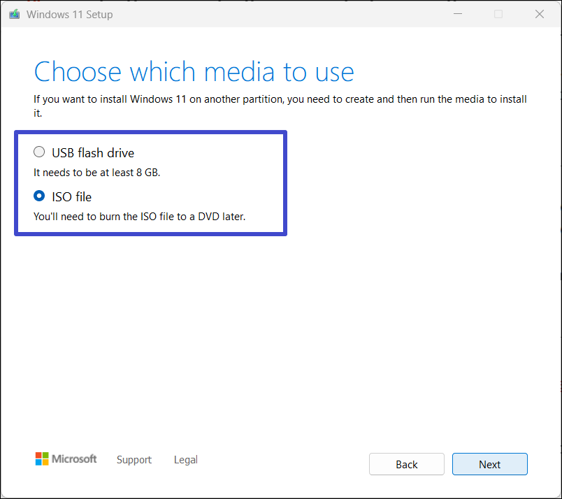 - Αρχείο ISO:Εάν επιλέξετε αυτήν την επιλογή, θα χρειαστεί να χρησιμοποιήσετε ένα εργαλείο όπως το Rufus για να κάψετε το αρχείο ISO που κατεβάστηκε αργότερα σε μια μονάδα USB.
