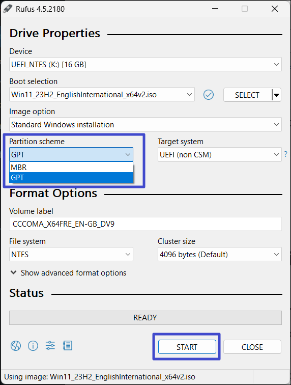 Όταν δημιουργείτε τα μέσα εγκατάστασης χρησιμοποιώντας την επιλογή Drive Flash USB, το εργαλείο θα διαμορφώσει αυτόματα τη μονάδα USB ως δίσκο MBR. Αυτό σας επιτρέπει να εγκαταστήσετε παράθυρα είτε σε δίσκο MBR είτε GPT, όσο η λειτουργία εκκίνησης ταιριάζει.