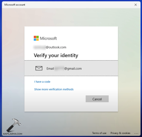 3.Σε περίπτωση που έχετε ενεργοποιηθεί ο έλεγχος ελέγχου ταυτότητας πολλαπλών παραγόντων (MFA), πρέπει να επαληθεύσετε την ταυτότητά σας. Επιλέξτε έναμέθοδος επαλήθευσης ταυτότηταςτην οποία έχετε ανατεθεί προηγουμένως στον λογαριασμό σας Microsoft και θα λάβετε έναν κωδικό σε εναλλακτικό email ή μέσω SMS ή μπορείτε επίσης να χρησιμοποιήσετε κώδικα από την εφαρμογή Authenticator. Αυτό εξαρτάται εντελώς από τον τρόπο με τον οποίο ρυθμίζετε το MFA για τον λογαριασμό σας. Εάν δεν υπάρχει MFA στον λογαριασμό σας, μπορείτε να πάτε στο επόμενο βήμα.