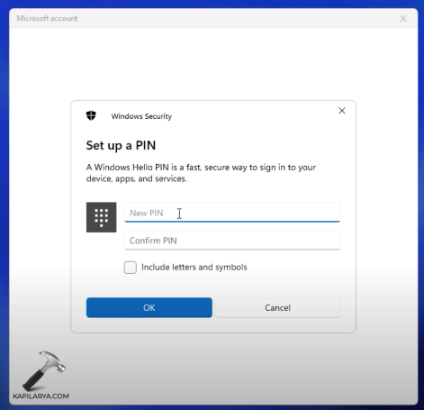 5.Μετά από αυτό, θα λάβετε ένα νέο αναδυόμενο παράθυρο Windows SecurityΡυθμίστε ένα PINεπικεφαλίδα. Πληκτρολογήστε το νέο σας PIN και επιβεβαιώστε το. ΚλικΕΝΤΑΞΕΙ.
