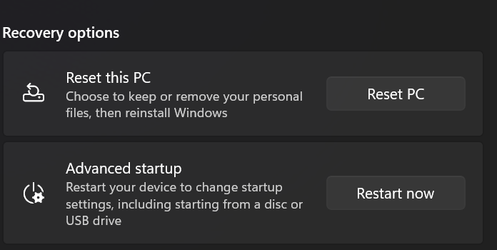 - Στη συνέχεια, κάντε κλικ στοΕπιλογή ανάκτησηςκαι πατήστε τοΕπαναφορά PCκουμπί.