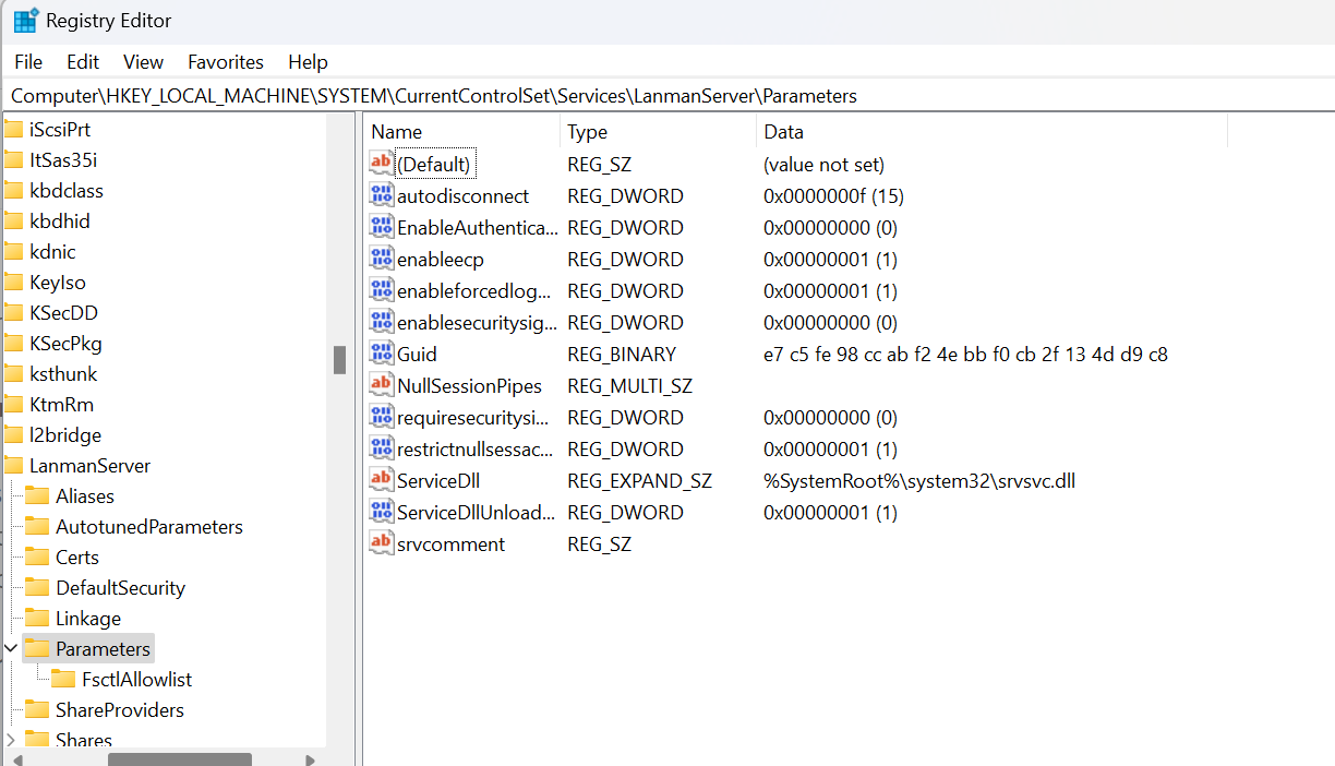 - Στη συνέχεια, στο αριστερό παράθυρο, επιλέξτεHKEY_LOCAL_MACHINE> Σύστημα> CurrentControlset> παραμέτρους lanmanserver>