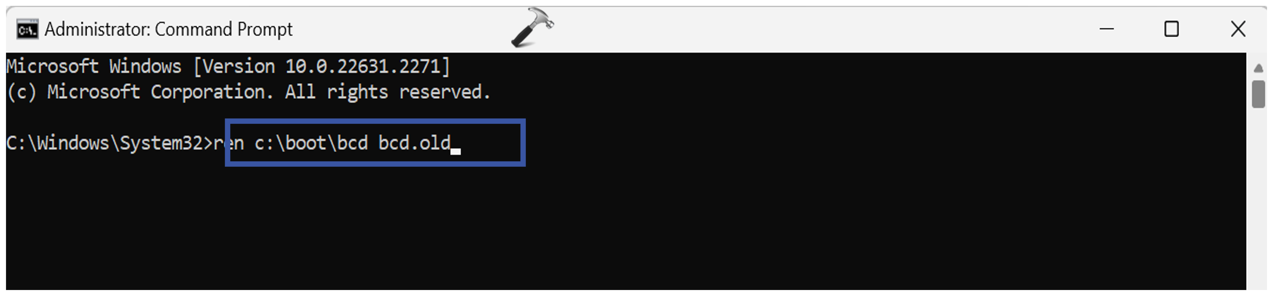 4. Τώρα, αντιγράψτε και επικολλήστε την παρακάτω εντολή για να μετονομάσετε και να ανοικοδομήσετε BCD: