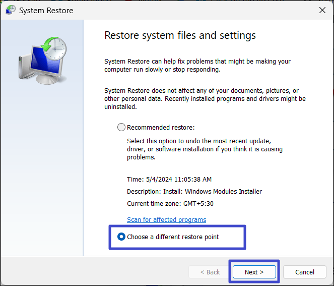 2. Στο παράθυρο επαναφοράς του συστήματος, επιλέξτε "Επιλέξτε ένα διαφορετικό σημείο επαναφοράς"Και κάντε κλικ στο"Επόμενος«.