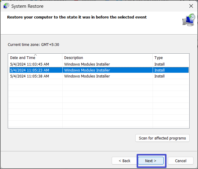 3. Από τη λίστα των σημείων αποκατάστασης, επιλέξτε το παλαιότερο και κάντε κλικ στο "Επόμενος".