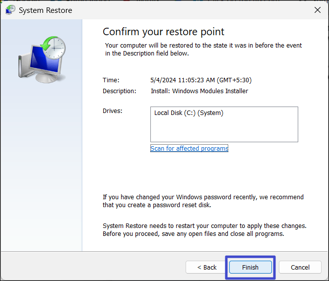 4. Τέλος, κάντε κλικ στο κουμπί "Φινίρισμα"Για να ξεκινήσετε τη διαδικασία επαναφοράς.