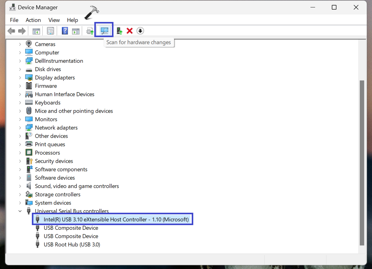 Εάν η συσκευή σας USB δεν αναγνωρίζεται, μπορείτε να δοκιμάσετε τη σάρωση για αλλαγές υλικού. Μερικές φορές, ο υπολογιστής ενδέχεται να μην ανιχνεύει τη συσκευή λόγω αλλαγών στις διαμορφώσεις υλικού.