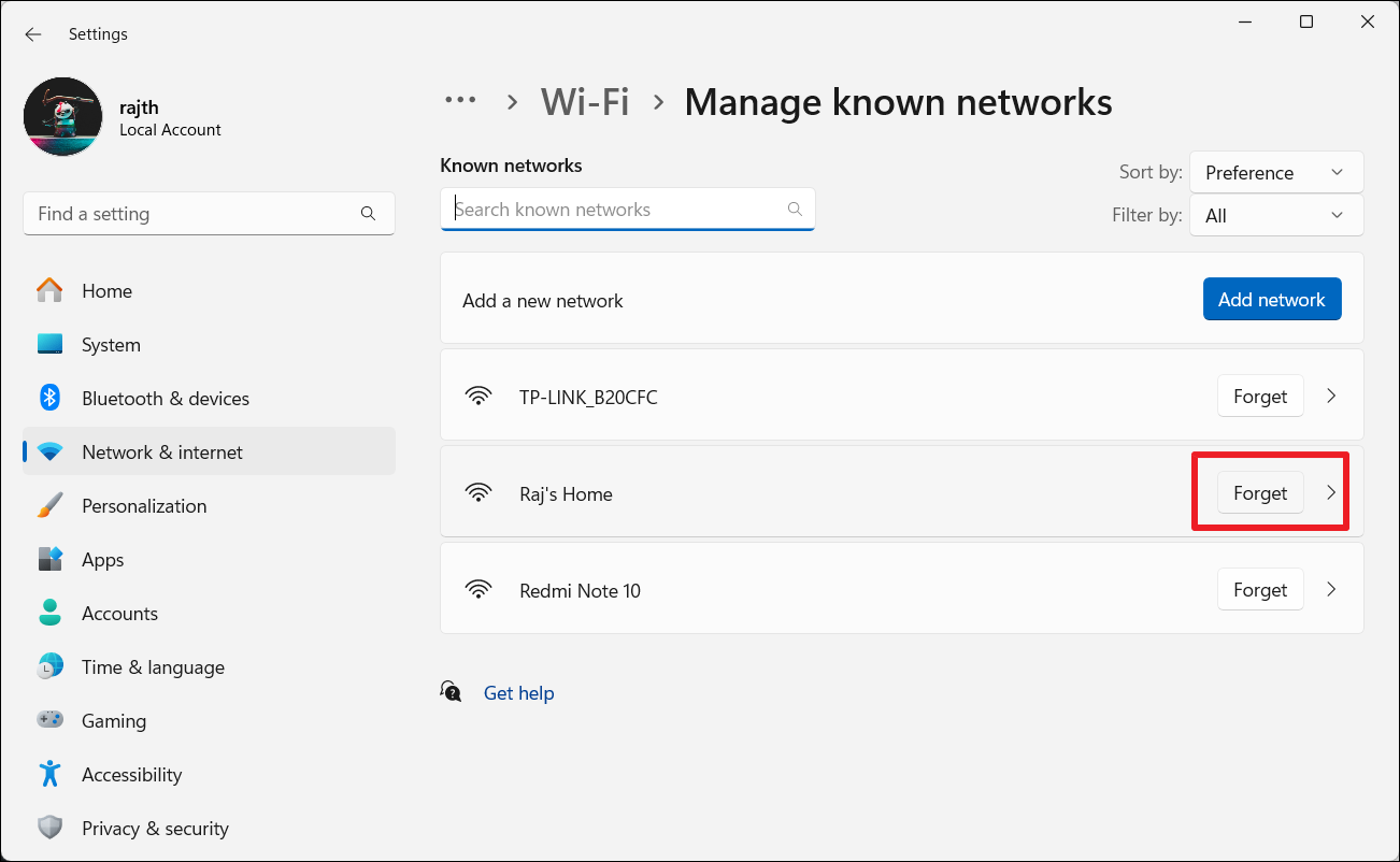 4. Κάντε κλικ στο "Ξεχνώ"κουμπί δίπλα στο δίκτυο WiFi που θέλετε να ξεχάσετε.