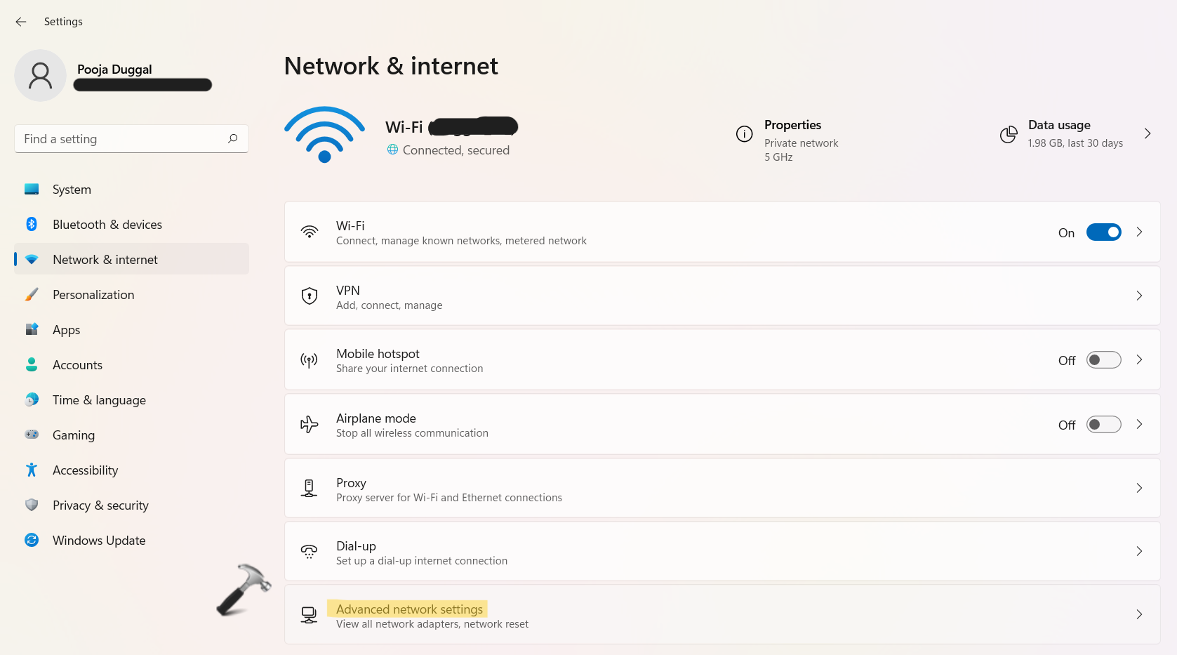 1.ΑνοιχτόΡυθμίσειςκαι πηγαίνετε στοΔίκτυο & ΔιαδίκτυοΜετά από αυτό, κάντε κλικ στοΠροηγμένες ρυθμίσεις δικτύου.