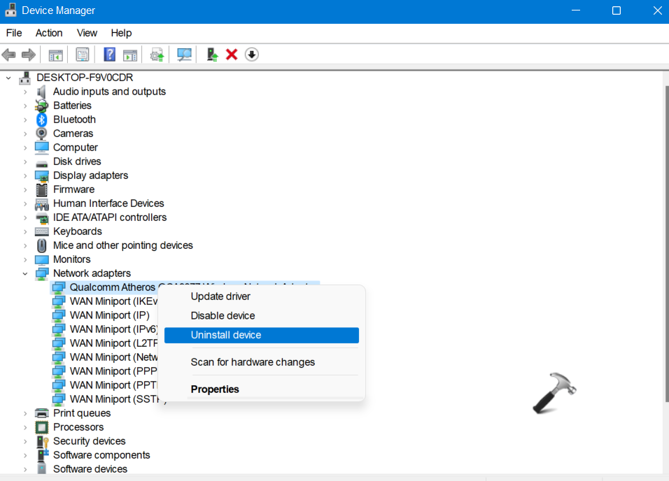 2.Μόλις ανοίξει, επεκτείνετεΠροσαρμογείς δικτύουΚαι κάντε δεξί κλικ στον προσαρμογέα ασύρματου δικτύου που θέλετε να επανεγκαταστήσετε. Τώρα, επιλέξτεΑπεγκαταστήστε το πρόγραμμα οδήγησηςαπό το μενού περιβάλλοντος.