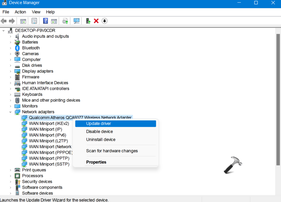 2.Μόλις ανοίξει, επεκτείνετεΠροσαρμογείς δικτύουΚαι κάντε δεξί κλικ στον προσαρμογέα ασύρματου δικτύου που θέλετε να ενημερώσετε. Τώρα, επιλέξτεΕνημέρωση του προγράμματος οδήγησηςαπό το μενού περιβάλλοντος.