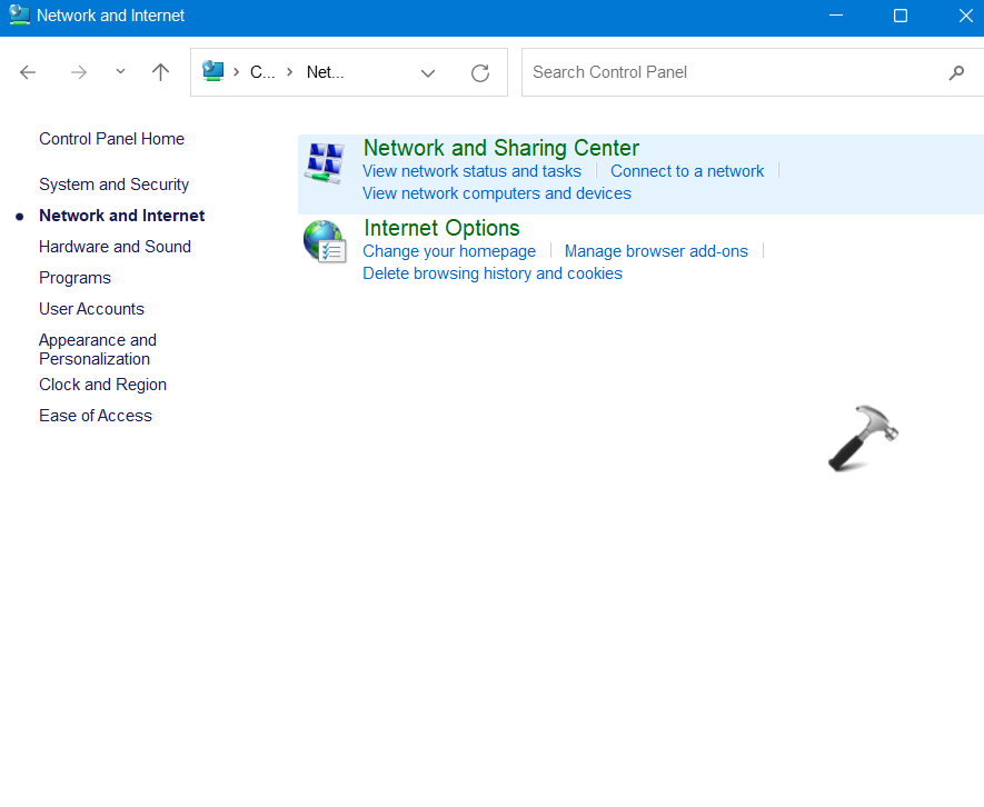 1.ΑνοιχτόΠίνακας ελέγχουκαι πηγαίνωΔίκτυο και Διαδίκτυο. Στη συνέχεια, κάντε κλικ στο κουμπίΚέντρο δικτύου και κοινής χρήσης.