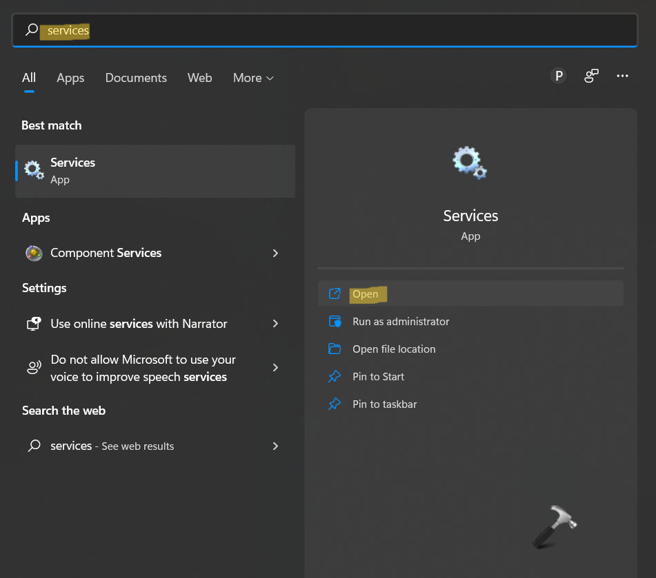 1.Πρώτον, ανοίξτε τοΥπηρεσίεςΧρησιμότητα μέσω των WindowsΕρευνα. ΤύποςΥπηρεσίεςστη στήλη αναζήτησης και κάντε κλικ στοΑνοιχτό.