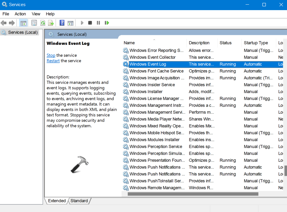 2.Τώρα, αναζητήστεΑρχείο καταγραφής συμβάντων των Windowsκαι ελέγξτε εάν η κατάστασή του είναιΤρέξιμο.