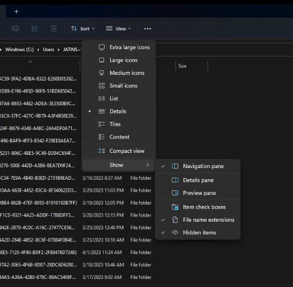 Μερικά από τα στοιχεία του φακέλου των θεμάτων μπορεί να υπάρχουν προοπτικές, οπότε μπορεί να μην τα βρείτε όλα. Σε αυτή την περίπτωση, επιλέξτε "Προβολή>" και, στη συνέχεια, "Εμφάνιση". Επιλέξτε "Κρυμμένα στοιχεία" από το αναπτυσσόμενο μενού.
