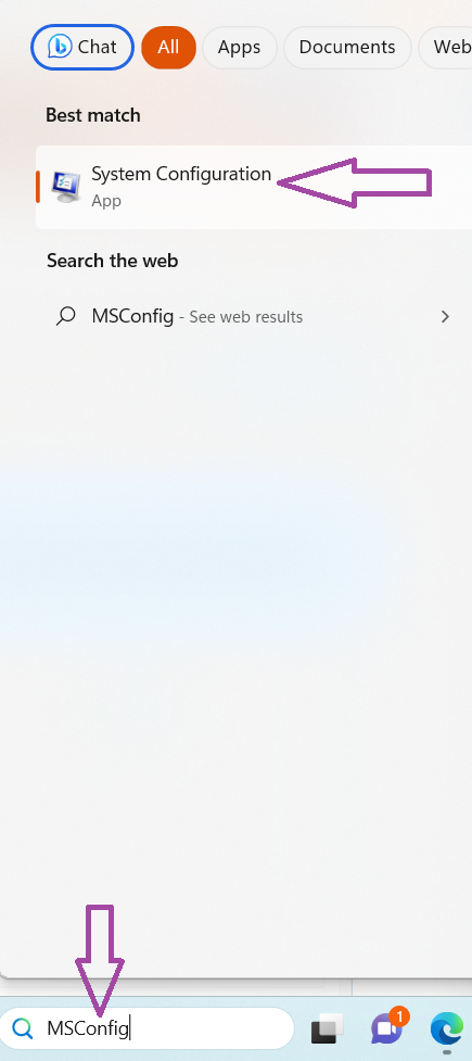 Πληκτρολογήστε msconfig στη γραμμή αναζήτησης και, στη συνέχεια, κάντε κλικ στο κουμπίΔιαμόρφωση συστήματος.