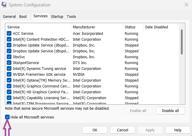 Στη συνέχεια, κάντε κλικ στοΥπηρεσίεςκαρτέλα και ελέγξτεΑπόκρυψη όλων των υπηρεσιών της Microsoftπλαίσιο ελέγχου.