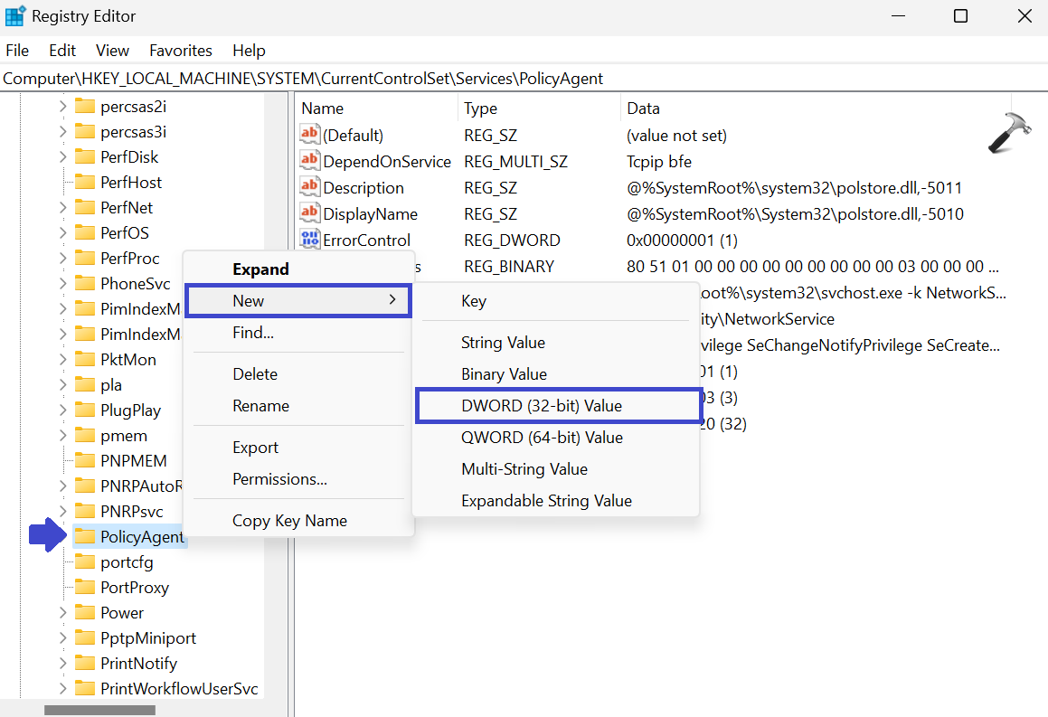 3. Κάντε δεξί κλικ στο "PolicyAgent" και επιλέξτε New => DWORD (32-bit) τιμή.