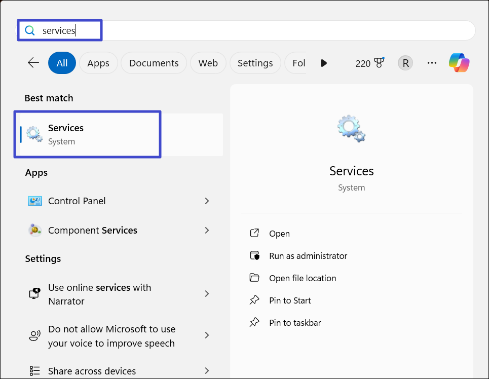 1. Ανοίξτε την αναζήτηση των Windows, πληκτρολογήστε "Υπηρεσίες "και επιλέξτε την εφαρμογή από τα αποτελέσματα αναζήτησης.