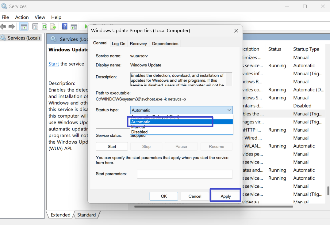 3. Επιλέξτε "Αυτόματο"Από τον τύπο εκκίνησης και κάντε κλικ στο"Εφαρμόζω«.