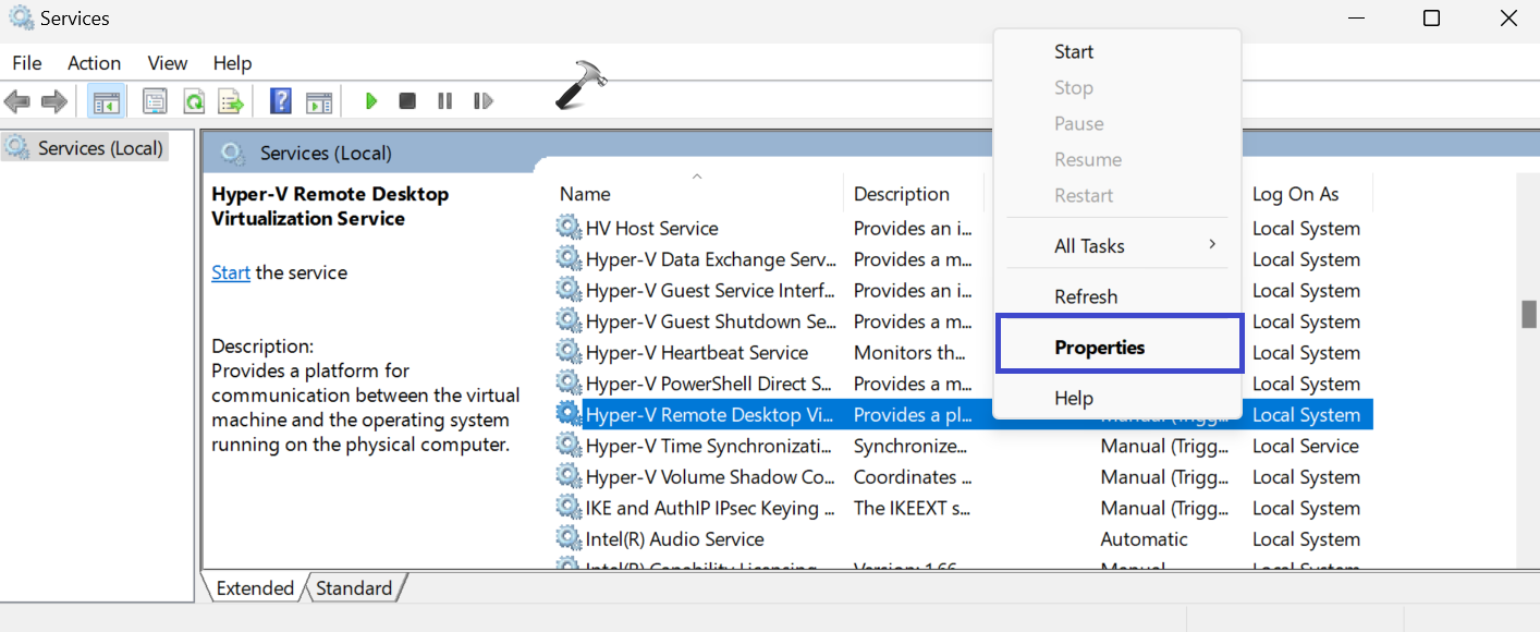 2. Κάντε δεξί κλικ στο "Υπηρεσία εικονικοποίησης Hyper-V Remote Desktop"Επιλογή και επιλέξτε"Σκηνικά θέατρου".