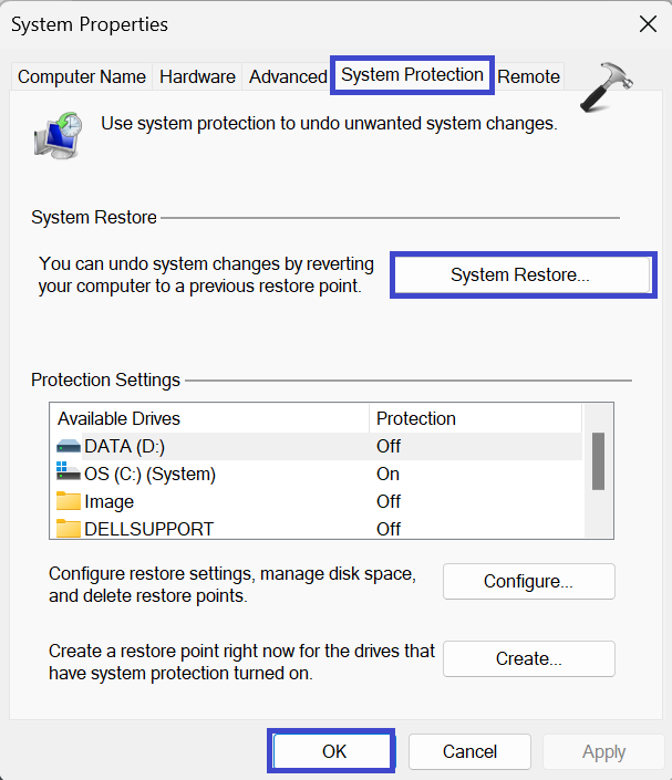 2. Κάτω από τοΠροστασία συστήματοςκαρτέλα, κάντε κλικ στο ""Επαναφορά συστήματος"Επιλογή. Πατήστε το επόμενο.