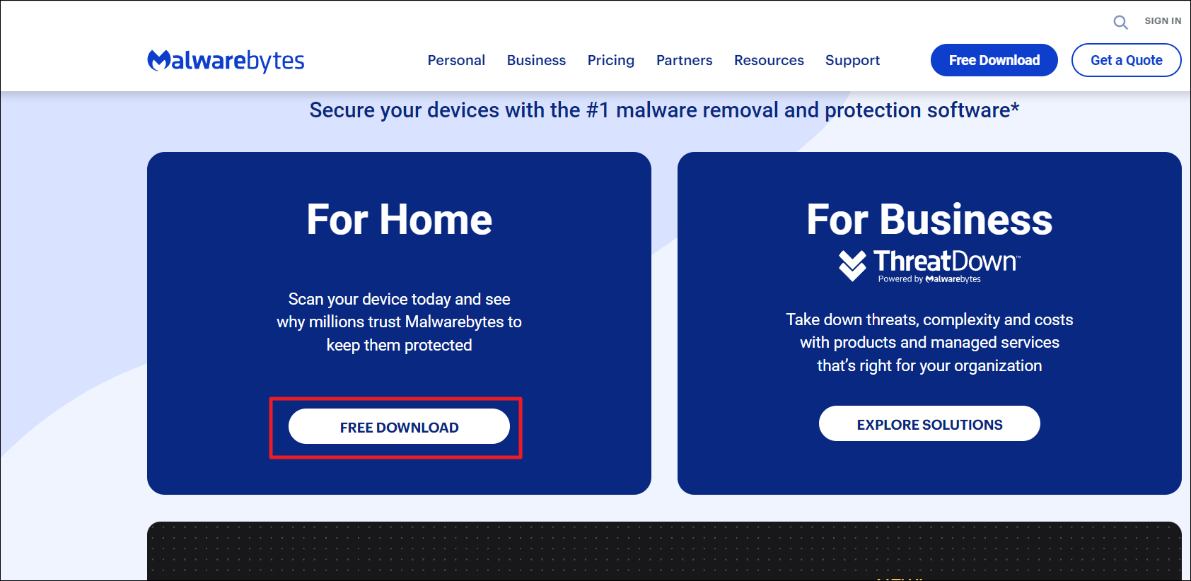 1. Πηγαίνετε στον ιστότοπο Malwarebytes (https://www.malwarebytes.com) και κάντε κλικ στο ""Δωρεάν λήψη "κουμπί για λήψη της δωρεάν έκδοσης.