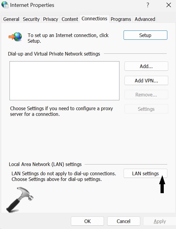 3. Κάντε κλικ στοΣυνδέσειςκαρτέλα, ακολουθούμενη από το κλικ στοΡυθμίσεις LANσύμφωνα με τις ρυθμίσεις του τοπικού δικτύου (LAN).