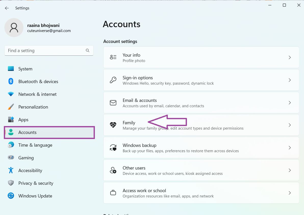2. Στη συνέχεια, κάντε κλικ στο κουμπίΛογαριασμοίΣτο αριστερό παράθυρο> κάντε κλικΟικογένειαΣτο δεξιό παράθυρο.