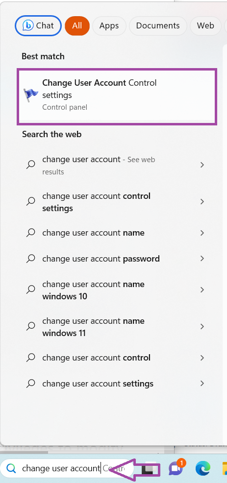 1. ΑνοίξτεΑλλαγή ελέγχου λογαριασμού χρήστηΑναζητώντας το στη γραμμή αναζήτησης.