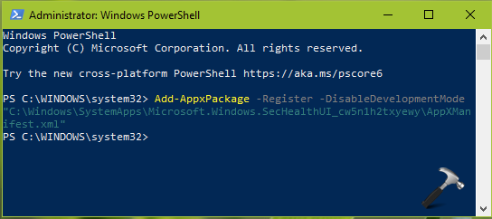 Add-AppxPackage -Register -DisableDevelopmentMode "C:WindowsSystemAppsMicrosoft.Windows.SecHealthUI_cw5n1h2txyewyAppXManifest.xml"