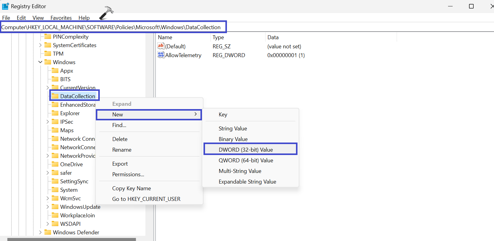 Για να δημιουργήσετε ένα κλειδί μητρώου, κάντε δεξί κλικ στο "Datacollection"Και επιλέξτε"Νέα => τιμή DWORD (32-bit)«.