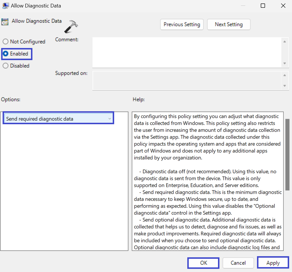4. Επιλέξτε το "Ενεργοποιημένος"Επιλογή και στη συνέχεια"Αποστολή προαιρετικών διαγνωστικών δεδομένων"Επιλογή.
