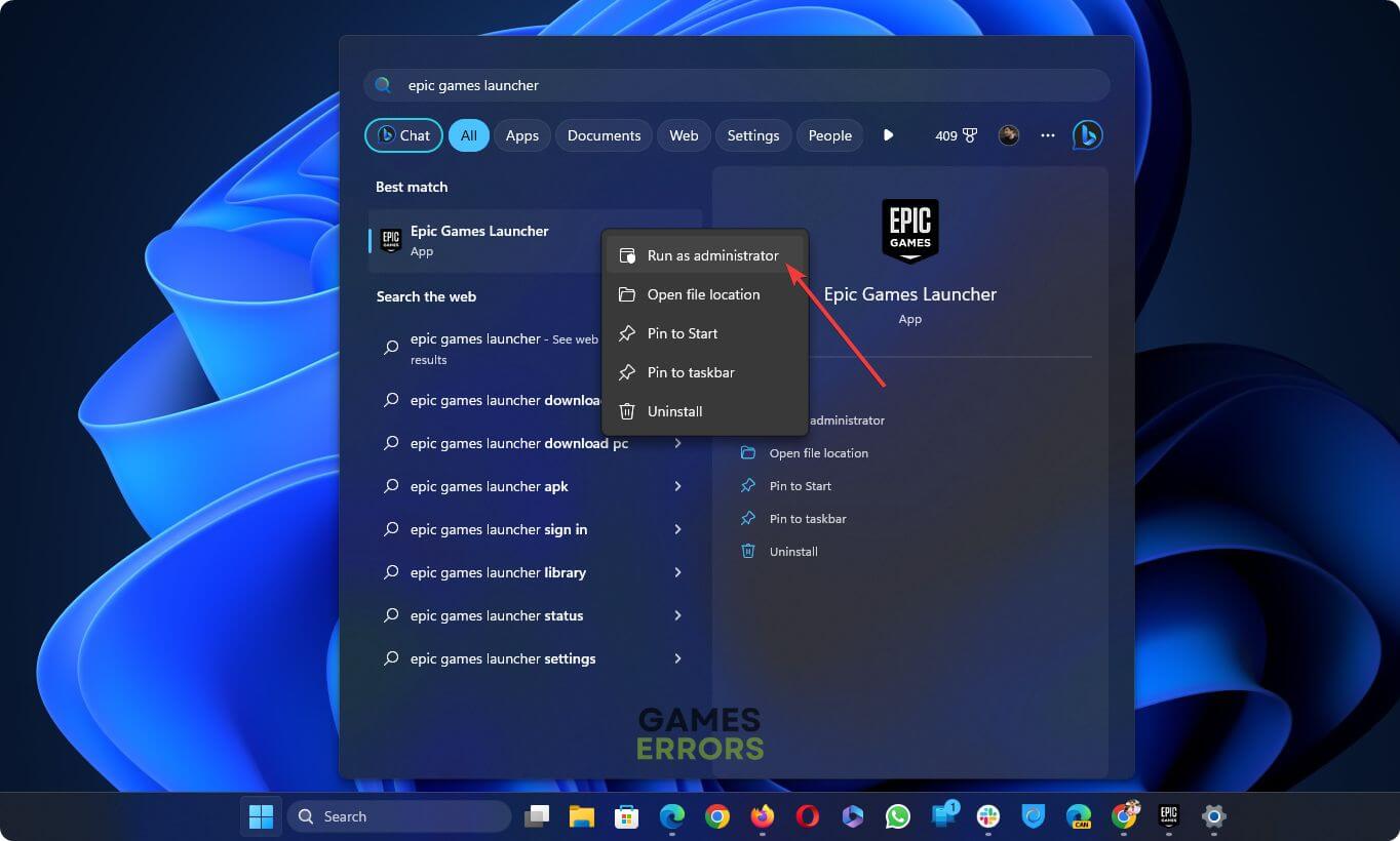- Κάντε δεξί κλικ στοΕκτοξευτής Epic Gamesκαι επιλέξτεΕκτελέστε ως διαχειριστής.