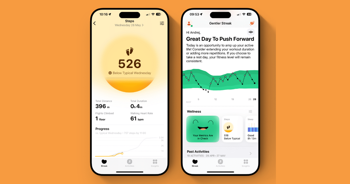 Ο ημερήσιος αριθμός βημάτων είναι μια λεπτή αλλά σημαντική προσθήκη. Αντί να σας ωθήσει να κυνηγήσετε αυθαίρετους στόχους, η Gentler Streak αντιμετωπίζει βήματα ως μέρος της μεγαλύτερης εικόνας: Πώς το σώμα σας κινείται, ανακάμπτει και προσαρμόζεται. Η ενημέρωση δεν απορρίπτει μόνο τους ακατέργαστους αριθμούς στον πίνακα ελέγχου σας. Δείχνει τον αριθμό των βημάτων σας παράλληλα με την απόσταση, το χρόνο περπατήματος, τον καρδιακό ρυθμό και τις πτήσεις που ανέβηκαν και συγκρίνει τη δραστηριότητά σας με τις προηγούμενες τάσεις με τρόπο που σας βοηθά να κατανοήσετε τα πρότυπα, όχι να τους εμμονή. Το ημερολόγιο των δύο εβδομάδων σάς επιτρέπει να μετακινηθείτε πίσω στις προηγούμενες ημέρες για να προβληματιστείτε για την κίνηση χωρίς πίεση.