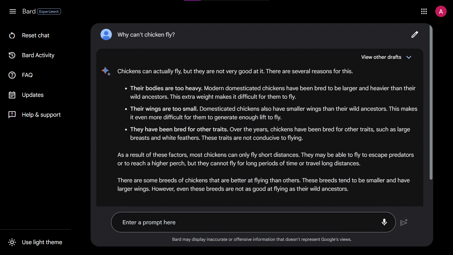 Το Google Bard μπορεί να είναι χρήσιμο με πολλούς τρόπους γιαέρευνα,γράψιμο,μετάφραση,κωδικοποίηση,απαντώντας σε ερωτήσεις,Δημιουργία δημιουργικού περιεχομένου,περισσότερο.