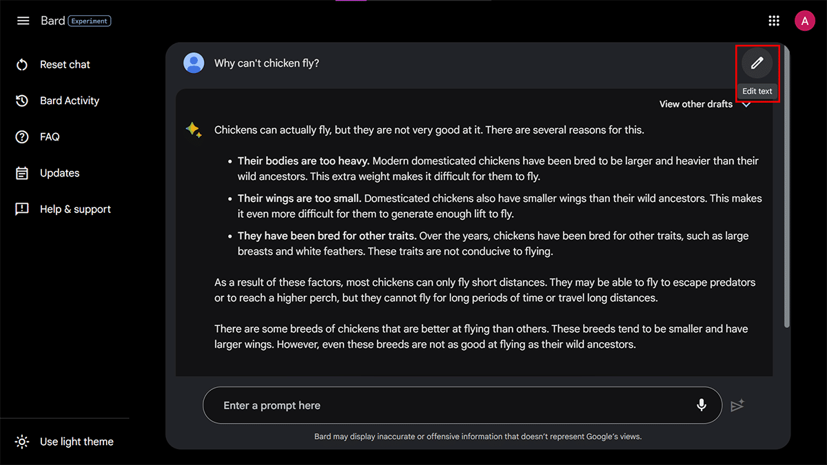 - Εκδίδω:Δίπλα στην προτροπή σας στο παράθυρο συνομιλίας, θα δείτε ένα κουμπί επεξεργασίας, αυτό σας δίνει τη δυνατότητα να επεξεργαστείτε την προτροπή σας για να λάβετε μια νέα απάντηση, η οποία μπορεί να είναι χρήσιμη αν συνειδητοποιήσετε ότι πρέπει να είστε πιο συγκεκριμένοι, αλλά δεν θέλετε να ξαναγράψετε την προτροπή σας.