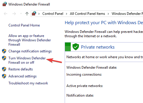 1. Επιλέξτε τοΑπενεργοποιήστε το τείχος προστασίας των Windows Defender (δεν συνιστάται)και για τα δύοιδιωτικόςκαικοινόΕπιλογές ρυθμίσεων δικτύου.