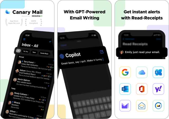 Το Canary Mail ενσωματώνει το Copilot AI για να βοηθήσει με τη γραφή, τη διόρθωση και τη σύνοψη των μηνυμάτων ηλεκτρονικού ταχυδρομείου. Λειτουργεί επίσης ως βοηθός AI για την ενίσχυση της παραγωγικότητας. Άλλα χαρακτηριστικά περιλαμβάνουν αποδείξεις ανάγνωσης, ενσωμάτωση με ένα κλικ, αναλύστε, αναβάθμιση και ενσωμάτωση ημερολογίου. Εάν χρειάζεστε μια προηγμένη εφαρμογή ηλεκτρονικού ταχυδρομείου για iPhone ή iPad, αυτό αξίζει να εξεταστεί.