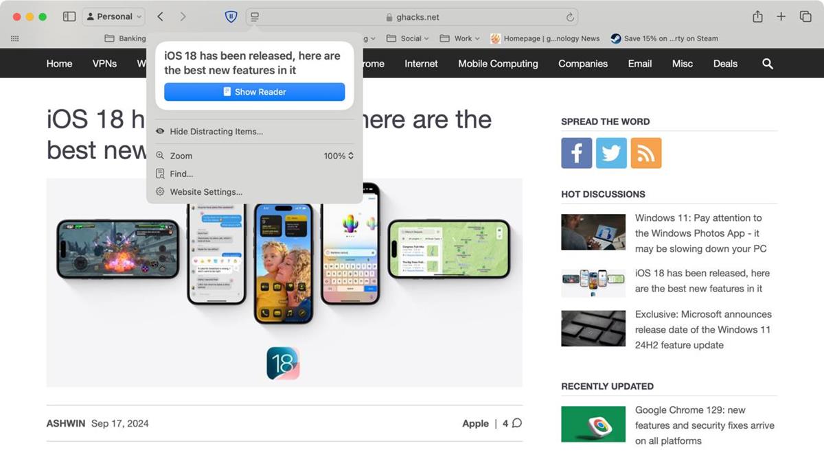 Το Apple Safari σας επιτρέπει τώρα να αποκρύψετε το περιεχόμενο που αποσπά την προσοχή στις ιστοσελίδες. Για να το χρησιμοποιήσετε, κάντε κλικ στο κουμπί μενού στη γραμμή διευθύνσεων, επιλέξτε Απόκρυψη στοιχείων αποσπάσεως. Αυτή η επιλογή σας επιτρέπει να διαβάσετε το κείμενο σε μια ιστοσελίδα χωρίς ενοχλητικά πανό ή άλλες οχλήσεις. Αλλά αυτό δεν είναι αναστολέας περιεχομένου, οπότε δεν θα εμποδίσει τις διαφημίσεις.