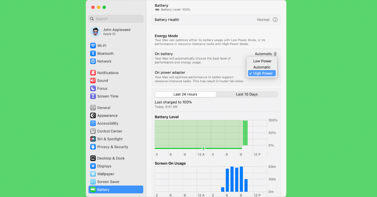 Η λειτουργία υψηλής ισχύος είναι εύκολα προσβάσιμος εντός των ενεργειακών ρυθμίσεων υπό τις προτιμήσεις του συστήματος. Οι χρήστες έχουν την ευελιξία να επιλέγουν μεταξύ αυτόματης, χαμηλής ισχύος ή λειτουργίας υψηλής ισχύος, ανεξάρτητα από το αν η συσκευή εκτελείται σε μπαταρία ή συνδέεται με έναν προσαρμογέα ρεύματος. Η επιλογή χρησιμεύει ως το αντίστοιχο σε λειτουργία χαμηλής ισχύος, που εισάγεται στο MacOS Monterey, για να επεκτείνει τη διάρκεια ζωής της μπαταρίας.