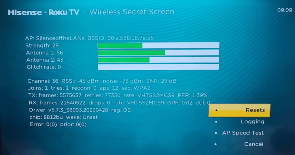 Το ασύρματο μυστικό μενού σας δείχνει πληροφορίες σχετικά με τη σύνδεση Wi-Fi της συσκευής Roku, συμπεριλαμβανομένου του ρυθμού δυσκολίας, των πληροφοριών καναλιού και της αντοχής σήματος.