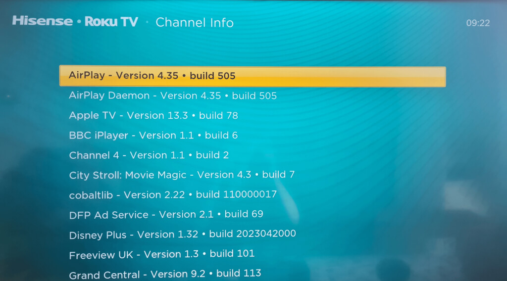- Θα πρέπει να δείτε το μενού πληροφοριών καναλιού με μια λίστα εγκατεστημένων καναλιών και εφαρμογών και τις κατασκευές και τις εκδόσεις τους.