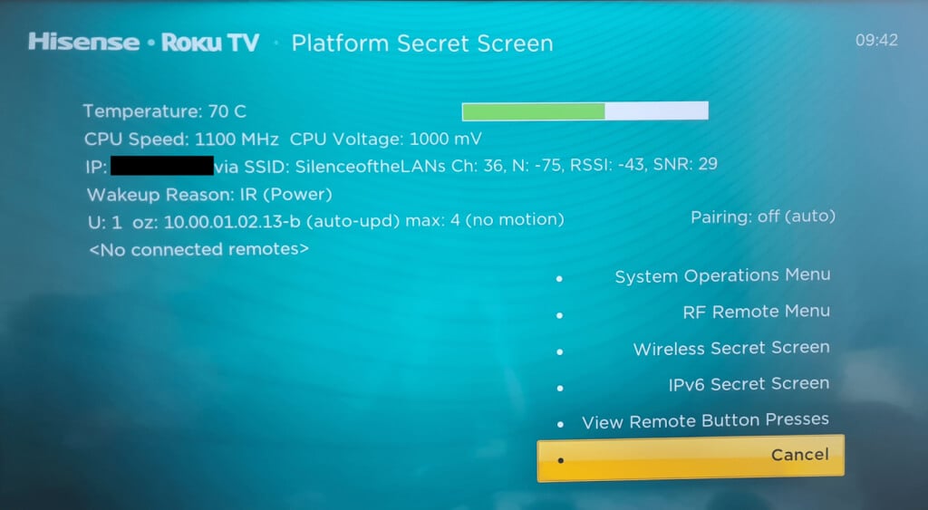 Για όλες τις πληροφορίες που χρειάζεστε σχετικά με τη συσκευή σας Roku, συμπεριλαμβανομένης της διεύθυνσης IP, της ταχύτητας CPU, της θερμοκρασίας της συσκευής, της κατάστασης ζευγαρώματος και άλλων, το μυστικό μενού της πλατφόρμας Roku είναι αυτό που έχει πρόσβαση. Από εδώ, μπορείτε επίσης να έχετε πρόσβαση στο RF Remote Menu και στο μενού λειτουργιών συστήματος με το πάτημα ενός κουμπιού.